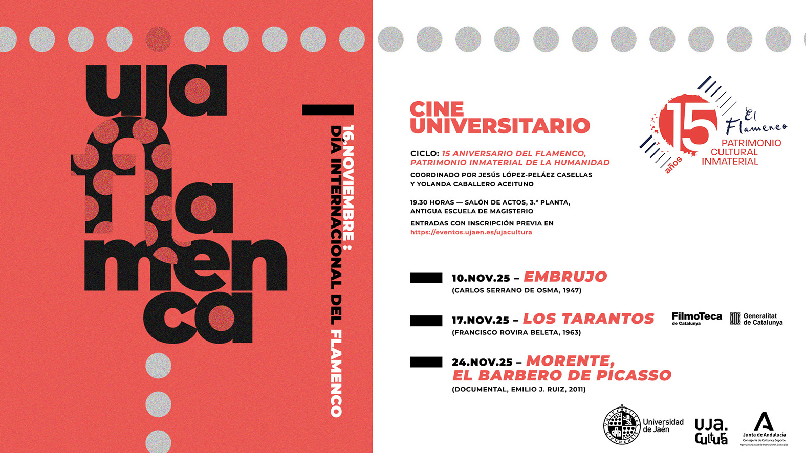 En concreto, son tres las iniciativas programadas. La primera, en el marco del cine universitario, el Ciclo Flamenco, coordinado por Jesús López-Peláez y Yolanda Caballero Aceituno. La primera sesión se celebrará el día 10 y se proyectará ‘Embrujo’ (1947, Carlos Serrano de Osma). De corte claramente surrealista, la película tuvo un enorme revuelo por la aparición de dos grandes estrellas del momento: Lola Flores y Manolo Caracol. El 17 de noviembre se proyectará Los Tarantos (1963, Francisco Rovira-Beleta). Basada en la obra de teatro de Alfredo Mañas ‘Historia de los Tarantos’, fue candidata al Óscar a la mejor película de habla no inglesa. Los protagonistas son Carmen Amaya y Antonio Gades. Por último, el 24 de noviembre se proyectará ‘Morente el barbero de Picasso’ (2011, Emilio J. Ruiz). Largometraje sobre Enrique Morente y la impresionante producción musical realizada sobre textos de Pablo Picasso y cantes flamencos más tradicionales. Este es el último trabajo en la vida de Enrique Morente, por lo que se ha constituido como su legado. Todas las proyecciones tendrán lugar a las 19 horas, en el Salón de Actos de la Antigua Escuela de Magisterio de Jaén.